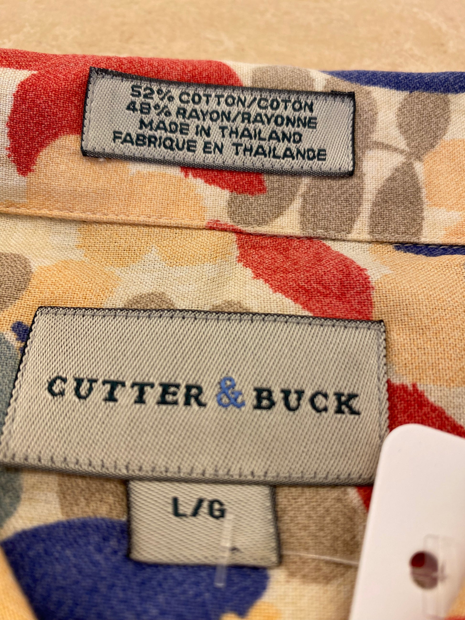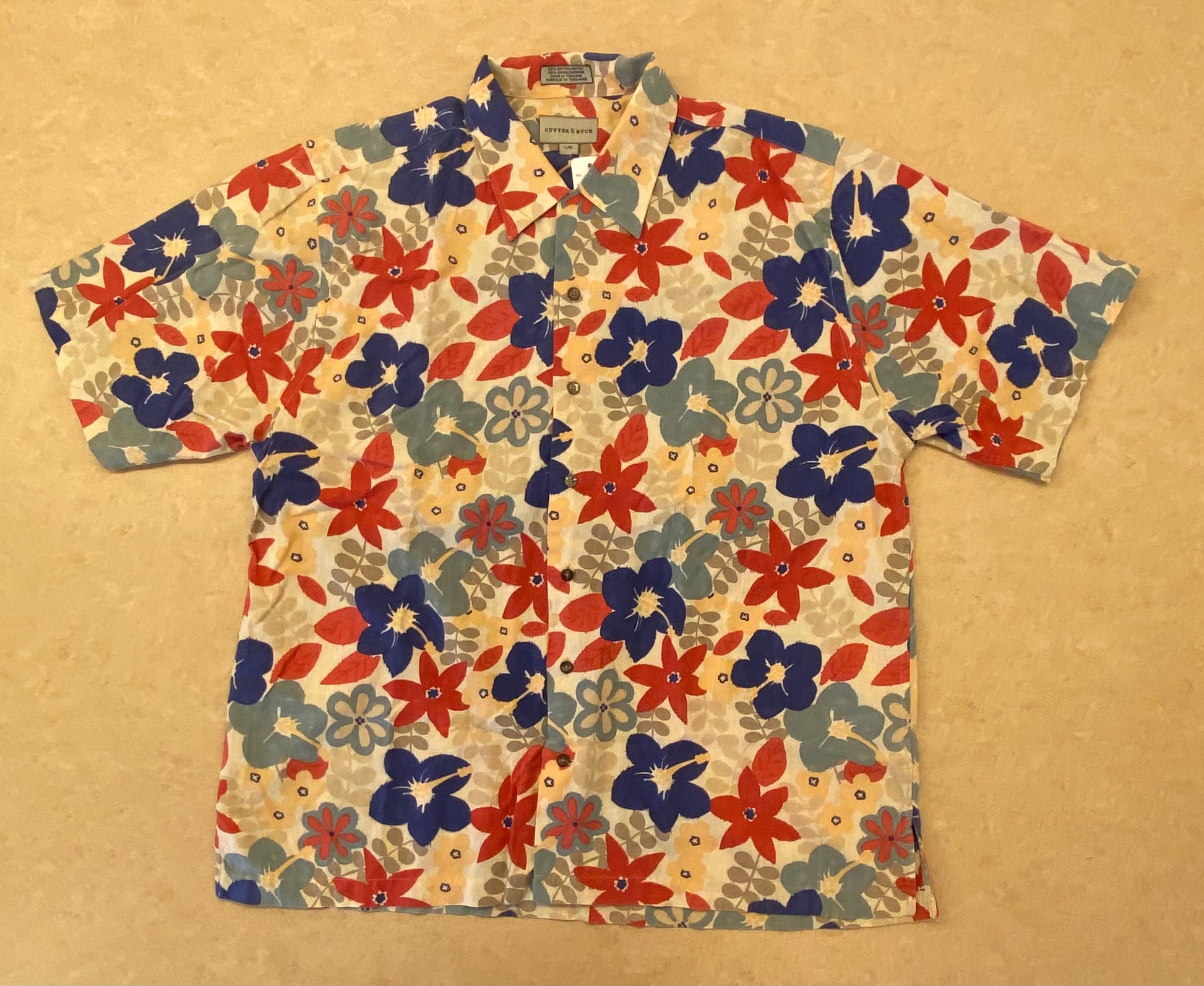 Elevate your summer wardrobe with this vibrant aloha shirt from the renowned Seattle-based brand, CUTTER & BUCK. Featuring a bold, multi-colored hibiscus floral pattern on a warm beige base, this shirt captures the essence of classic island style with a sophisticated touch.