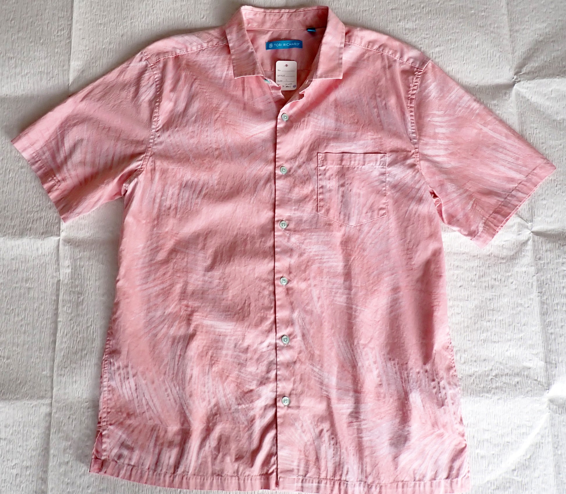 This used aloha shirt is by TORI RICHARD. It's made of 100% cotton and has a refreshing pink background with a leaf pattern.