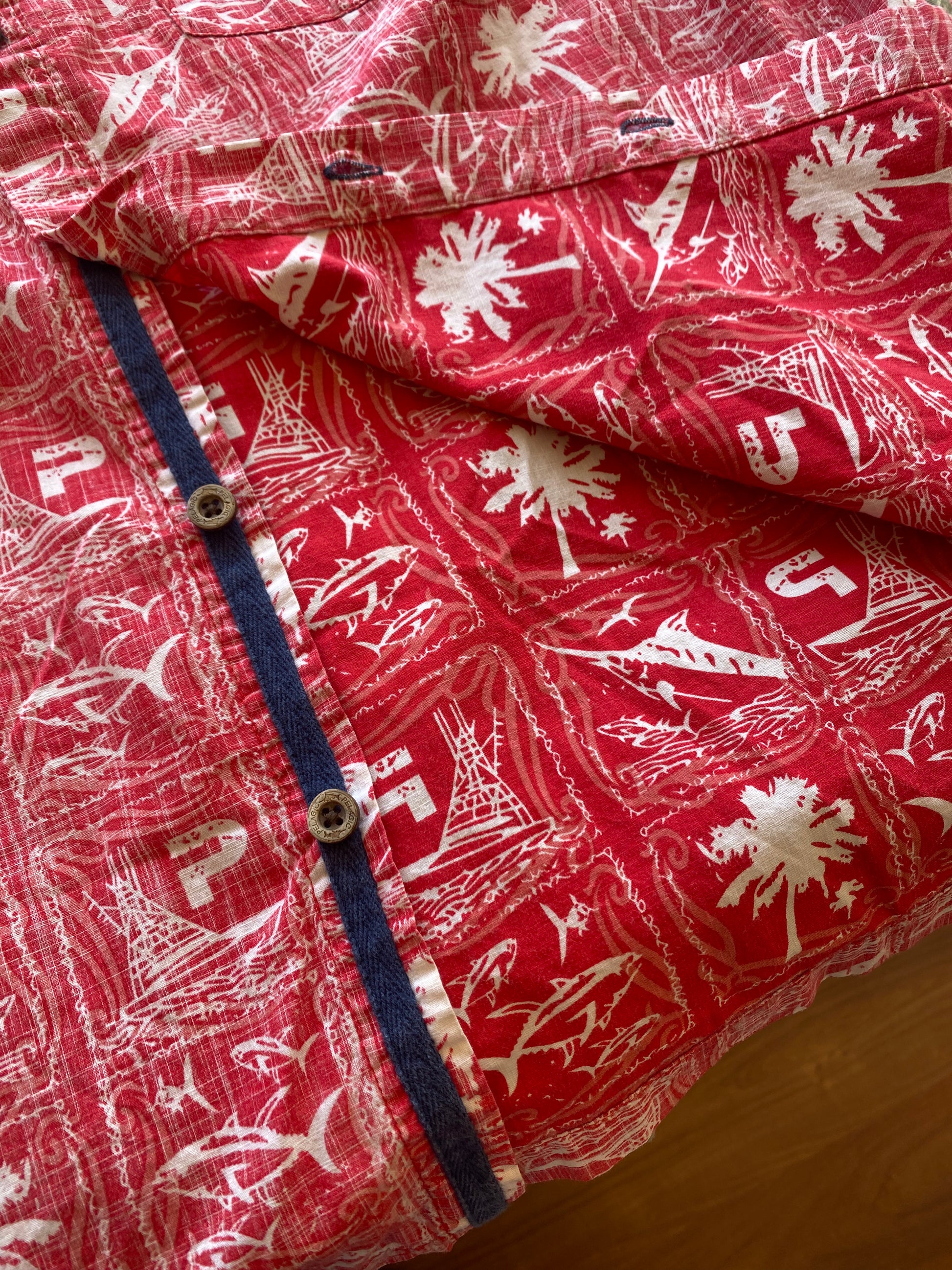 赤を基調としたボディに、ブランドの象徴であるカジキ(マーリン)、ヨット、パームツリーが格子状にデザインされた、遊び心あふれるパネルプリントが特徴。一見派手に見えますが、規則正しい配置により、大人のカジュアルスタイルに馴染むスマートな印象に仕上がっています。