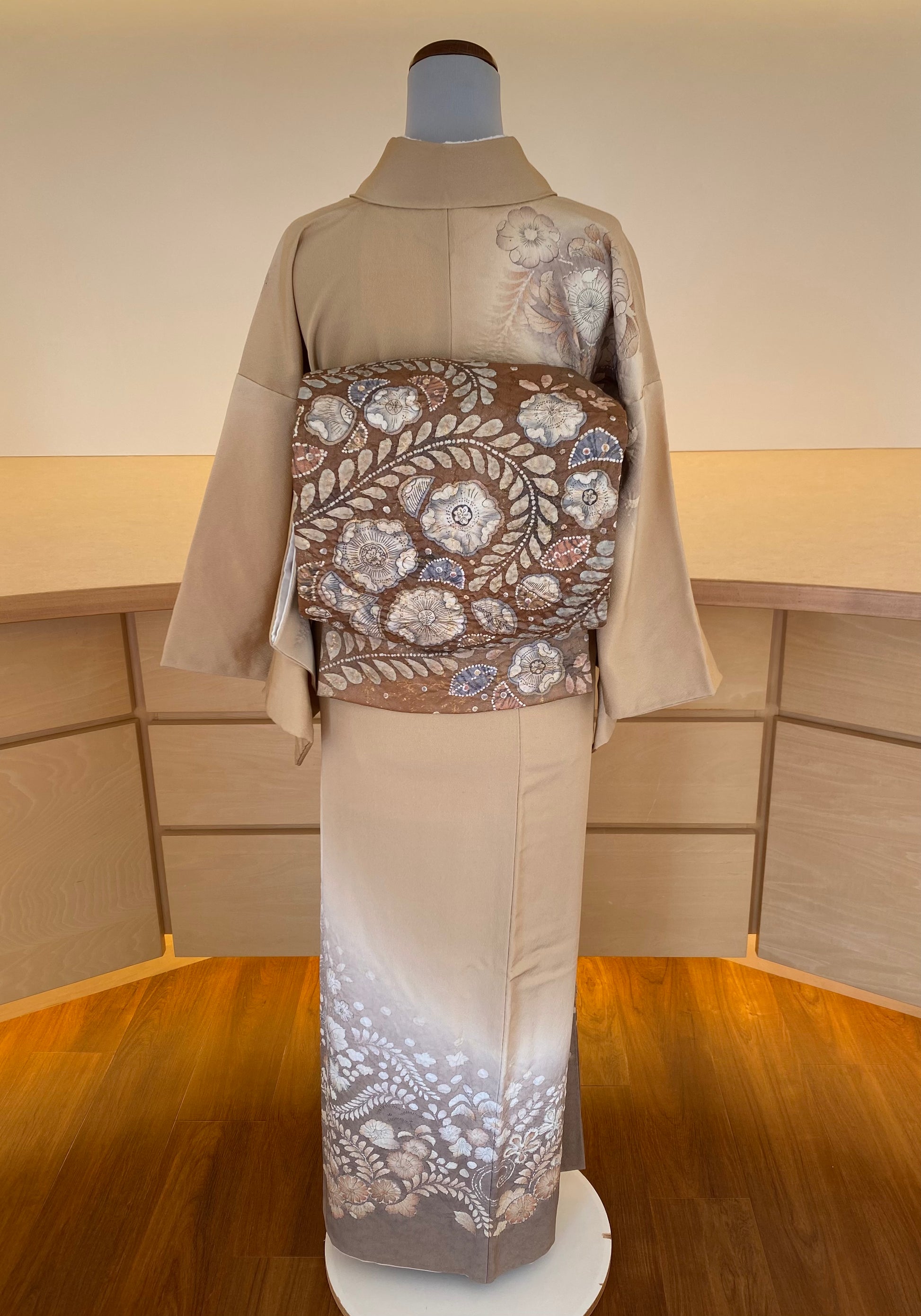 穏やかで肌馴染みの良いベージュの地色に、流れるような辻ヶ花染めの模様が美しい一着です。