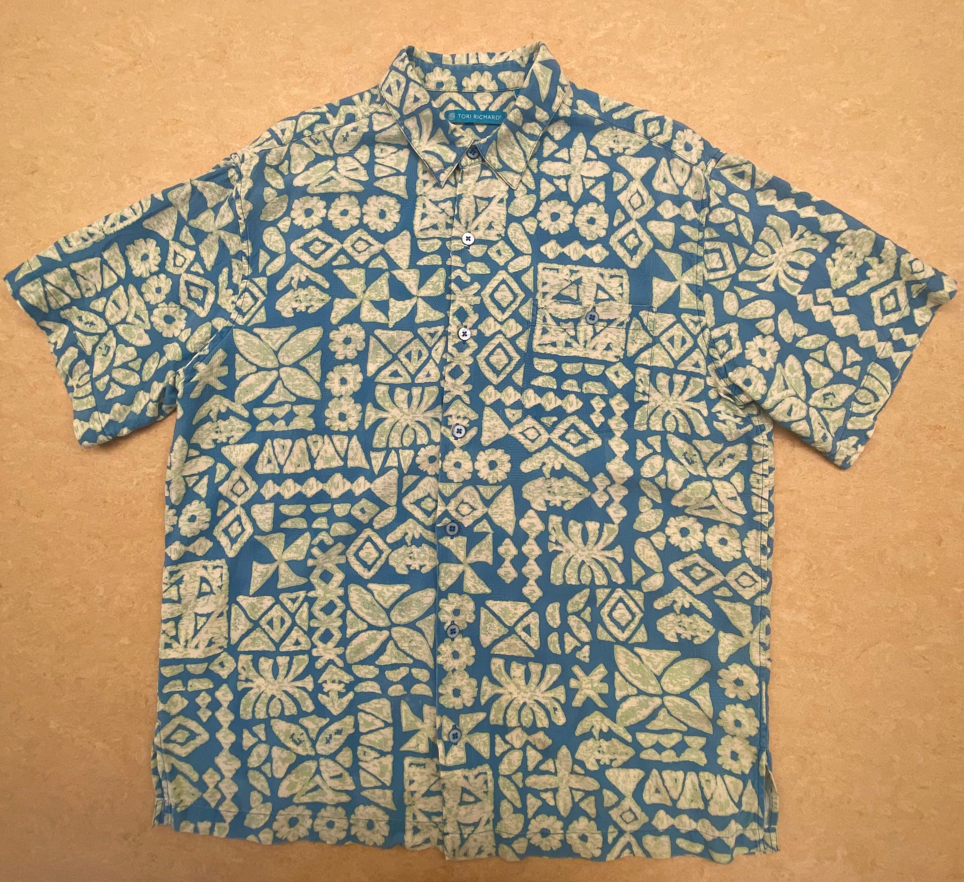This"used Aloha Shirt" is a direct from Hawaii product by TORI RICHARD. Made of 75% silk and 25% cotton, this size L shirt is comfortable to wear and made of high quality materials. Unique design and fashionable atmosphere.