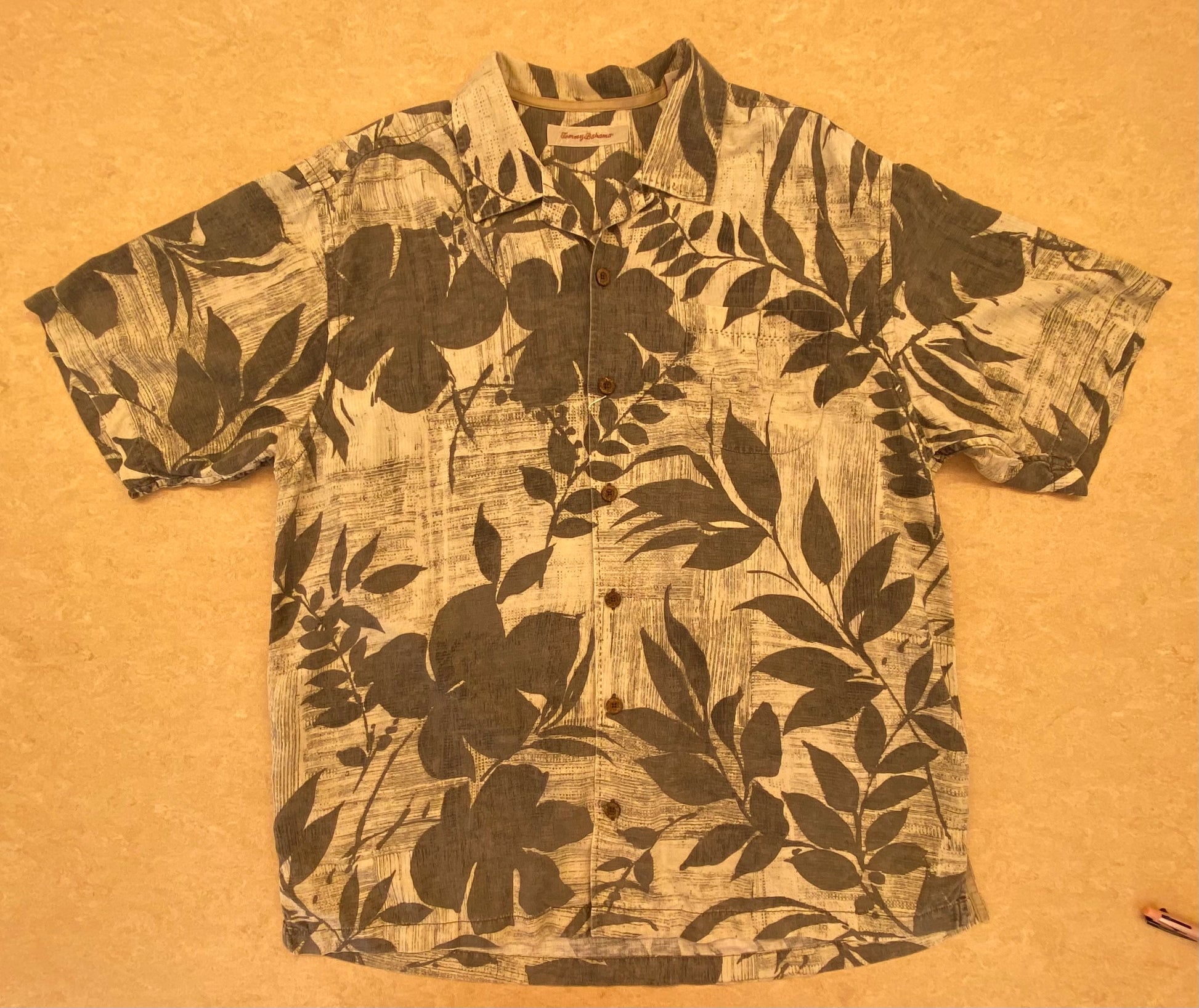 The USED Aloha shirt is made of 100% silk by Tommy Bahama. The design is chic and fashionable and offers high quality comfort. This item is cool and comfortable.